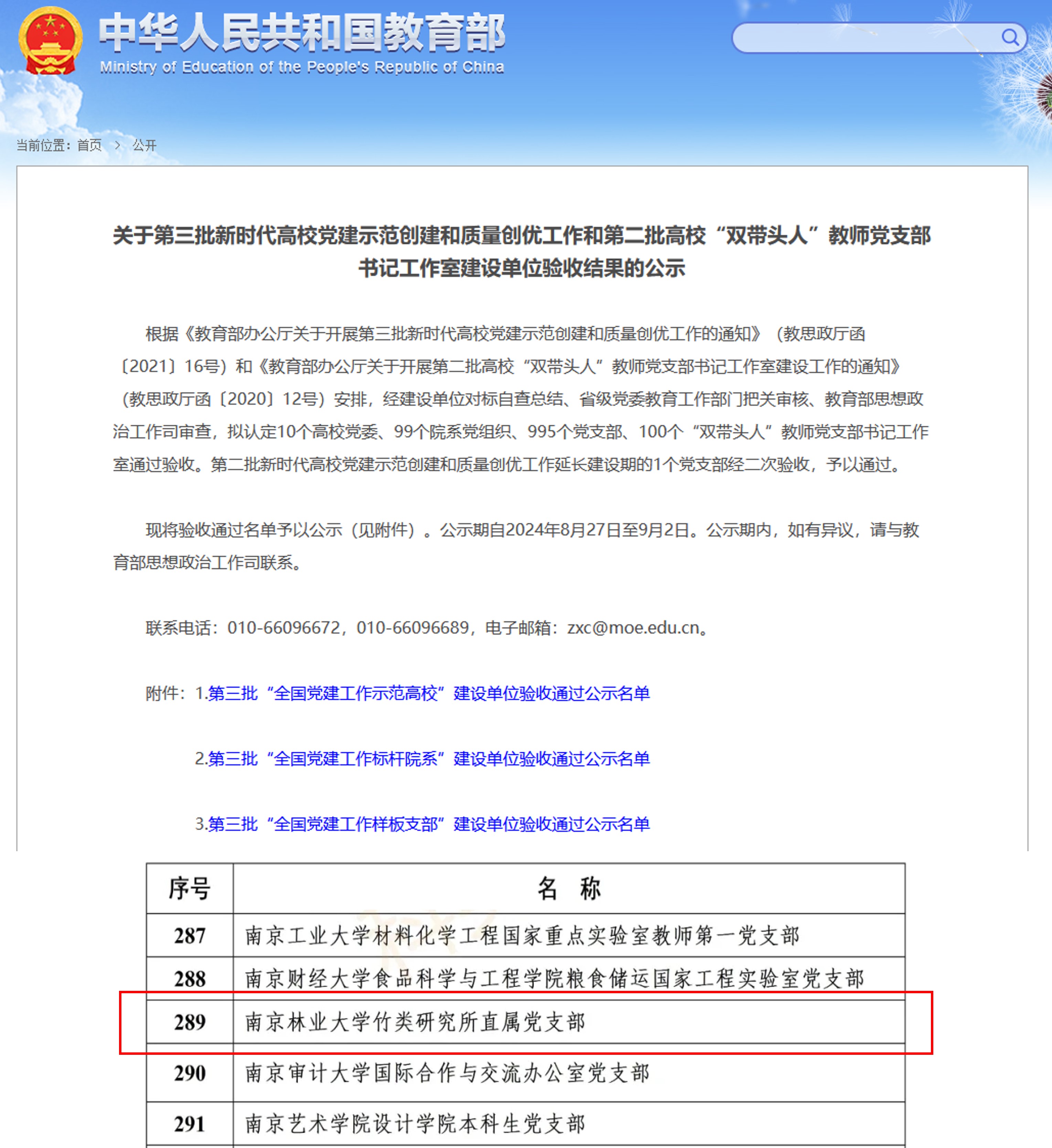 8月27日,教育部思想政治工作司公布了第三批新时代高校党建示范创建和质量创优工作建设单位验收结果,竹类所直属党支部顺利通过“全国党建工作样板党支部”验收。